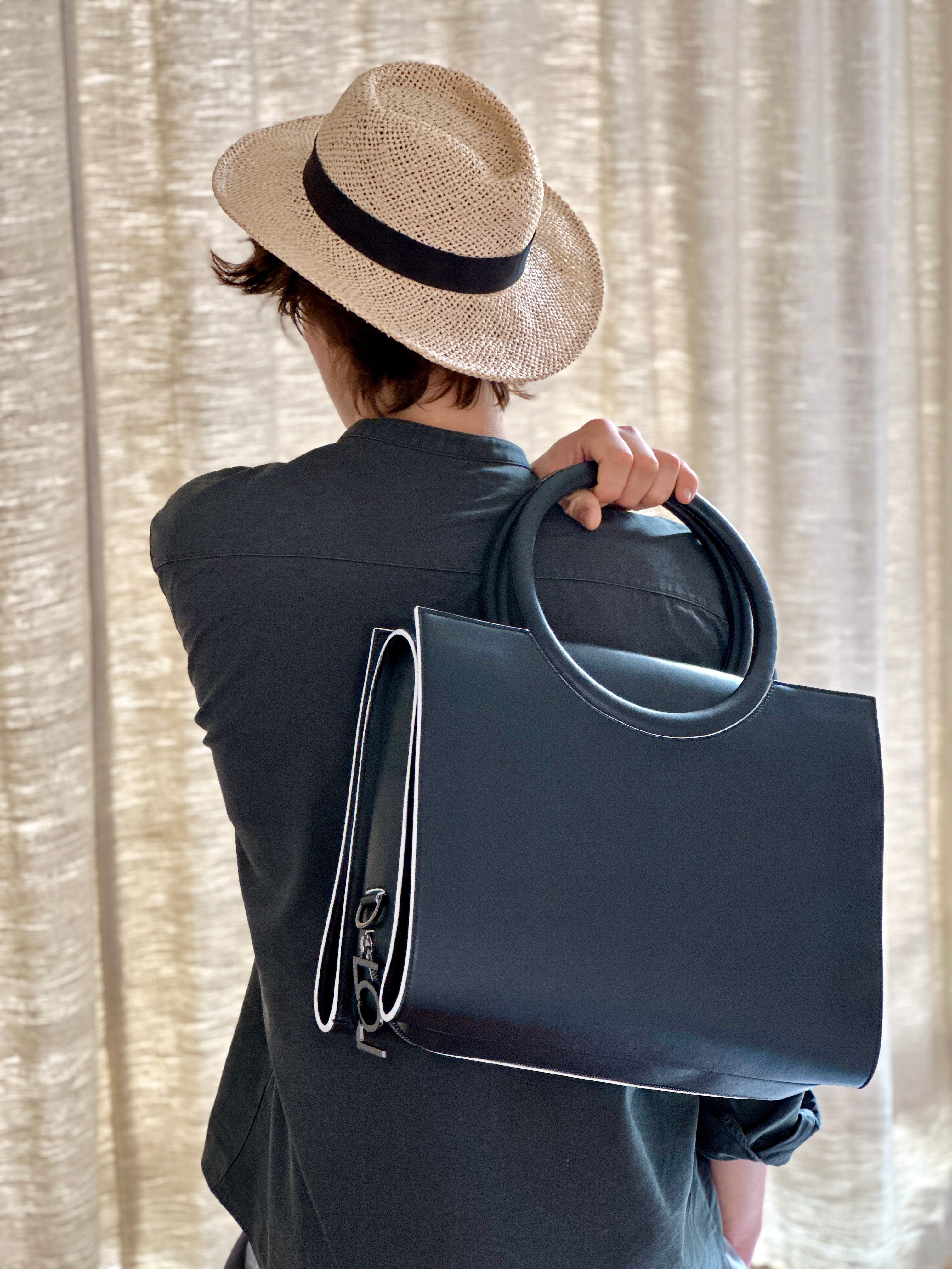 - trois déclinaisons monochrome en cuir noir lisse, avec un « coupé net » bleu Klein (1551) et un « coupé net » blanc (1331), qui soulignent les lignes et courbes du sac.